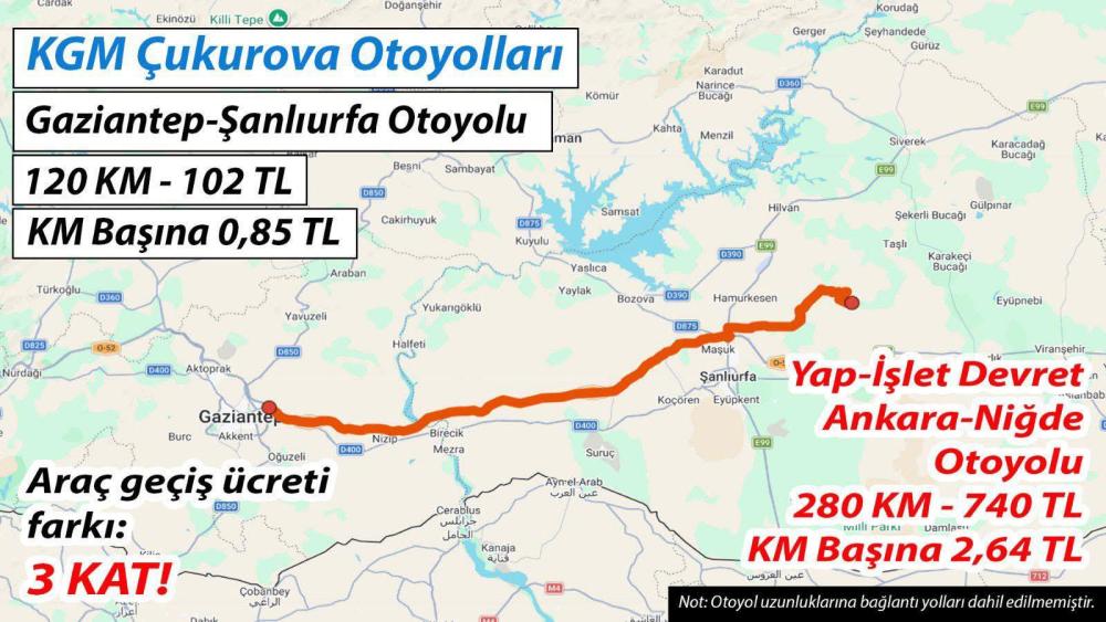 Meriç, mevcut durumda kamu tarafından işletilen Gaziantep–Şanlıurfa Otoyolu’nda kilometre başına ücretin yaklaşık 0,85 TL seviyesinde olduğunu hatırlattı. Yap-İşlet-Devret (YİD) modeliyle işletilen diğer otoyollar örnek alındığında geçiş ücretlerinin 270 TL’ye kadar çıkabileceğini ifade eden Meriç, bu artışın vatandaş üzerinde ciddi bir yük oluşturacağını belirtti.